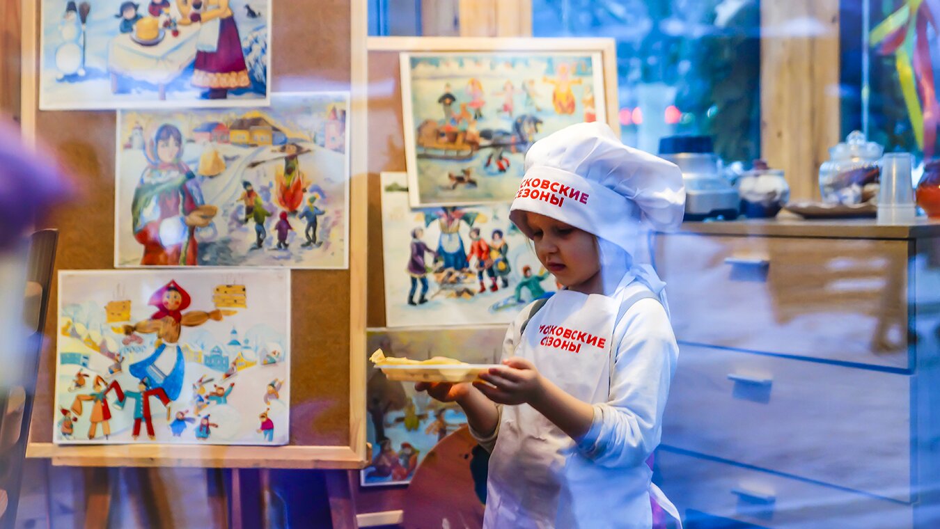 Мастер-классы по выпечке блинов — бесплатные для детей от 6 лет, их проводит кулинарная студия «Ева» (в будни с 15:00, в выходные с 12:00 до 18:45, по 45 минут). Домик яркий, теплый, украшен платками, флажками, лентами. Желающих печь блины очень много, пускают по 15 человек, а родителей просят подождать снаружи. Временами в группе даже больше мальчиков, чем девочек, и стараются они так усердно, что дают фору девчонкам — очень уж хочется угостить мам.