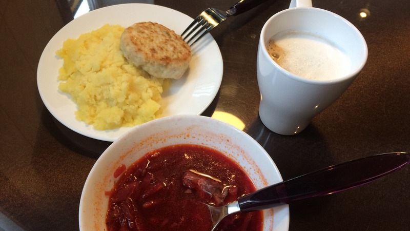 В продаже несколько видов супов (от 95 до 120 рублей), вторые блюда, гарниры, различные салаты (от 28 до 78 рублей за сто грамм), пирожки (от 25 до 50 рублей). Во время масленицы был расширенный ассортимент разнообразных блинов, сейчас много постных блюд. Кроме того, есть различные десерты (от 40 до 120 рублей), мороженое, сделанное вручную, свежесваренный кофе.