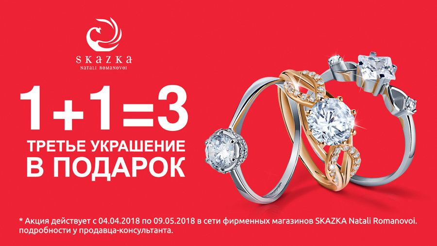Большая коллекция наручных часов — мужских и женских. Если Вы подыскиваете подарок для близкого человека, наша рекомендация — подарите выбор! Всегда в наличии подарочные сертификаты номиналом 500, 1000, 3000 и 5000 руб. Прямо сейчас действует акция «1+1=3». Получить украшение бесплатно — легко! Приходите в магазин SKAZKA, выбирайте 2 изделия и получите третье В ПОДАРОК!