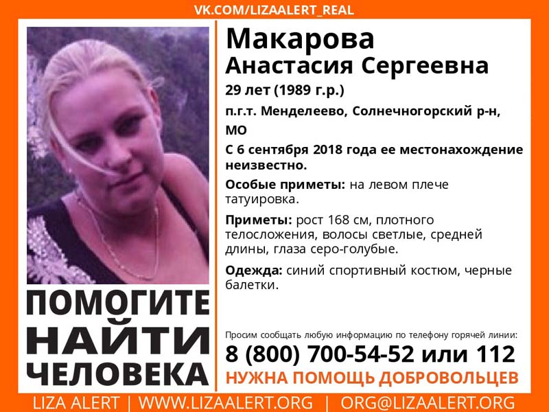 Местонахождение пропавшей в Менделеево Анастасии Макаровой неизвестно с 6 сентября.