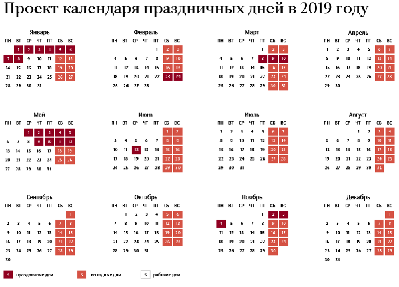 Таким образом, после подписания проекта правительством, выходные в 2019 году будут выглядеть так: