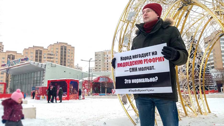 В разных районах столицы 3 января состоялись одиночные пикеты против повышения пенсионного возраста. Минимум один заметили на площади Юности в Зеленограде, сообщает информационное агентство «Красная весна».