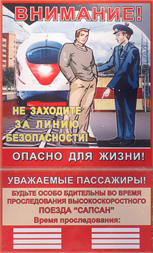 Когда начал ходить высокоскоростной «Сапсан», на станциях Московского отделения Октябрьской железной дороги установили плакаты, призывающие пассажиров быть бдительными при прохождении поезда. Такой щит есть и на платформе станции Крюково. Однако ячейки, в которых должно быть расписание «Сапсана», не заполнены. Как пояснил на прошедшей пресс-конференции и.о. начальника оперативной службы Северо-Западной дирекции организации скоростного сообщения ОЖД Михаил Полянский, пустоты в плакате не случайны. «В плакате графы не заполнены, так как решили принять меры по борьбе с терроризмом, чтоб не подсказывать террористам время прохождения „Сапсана“».