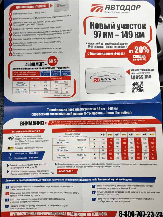 Стоимость проезда и скидки по транспондерам по участку М-11 от Солнечногорска до Твери устанавливаются владельцем дороги — ГК Автодор. Например, тариф от Москвы до Твери (Воскресенское) будет автоматически складываться из цены на проезд по участку Москва-Солнечногорск и Солнечногорск-Тверь (Воскресенское) и рассчитываться по факту выезда с дороги. При этом, существенно сэкономить можно, используя абонементы на проезд, доступные владельцам транспондеров М-11.
