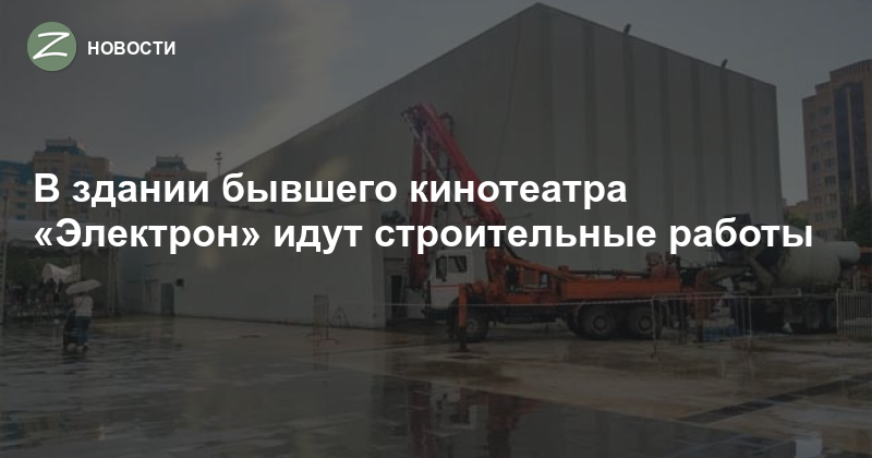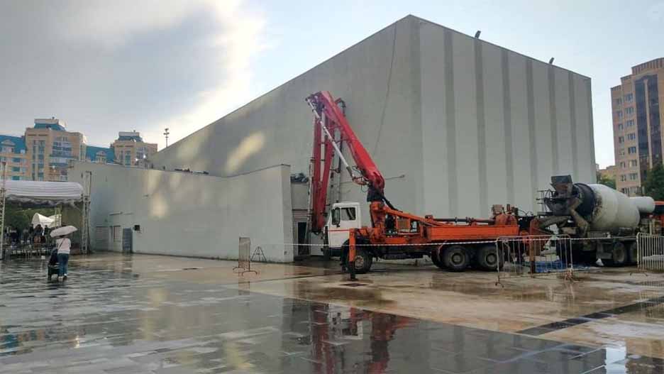 К зданию подогнали бетономешалку и через специальный рукав подают бетон внутрь. Что именно там делают, неизвестно — может быть, укрепляют фундамент, может быть, заливают полы.