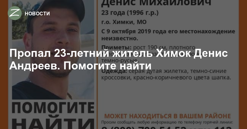 С 9 октября неизвестно местонахождение 23-летнего химчанина Дениса Андреева. Есть информация, что молодой человек мог отправиться в Зеленоград. Его ищут также в Москве и Московской области.