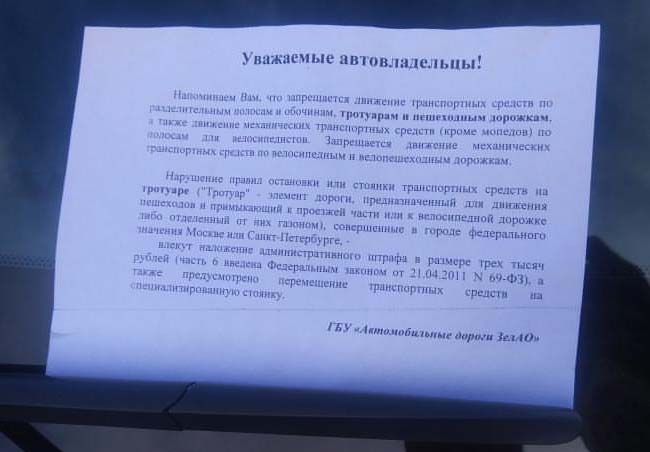 Листовки с предупреждением написаны от имени учреждения «Автомобильные дороги ЗелАО», основная деятельность которого — обслуживание и уборка автодорог.