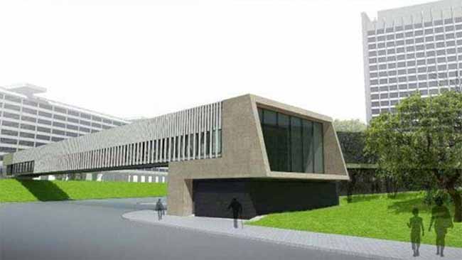 Архитектурное решение моста — брутальный стиль, «подчеркнуто массивное и строгое сооружение, перекликающееся с модернистской стилистикой „Флейты“ и префектуры», как анонсировала Москомархитектура. Опоры облицуют травертином. Со стороны префектуры в переходе будет лифт. К корпусу 360 пешеходы будут спускаться по уклону тротуара. Сейчас на месте будущей опоры моста возле «Флейты» только забивают сваи.