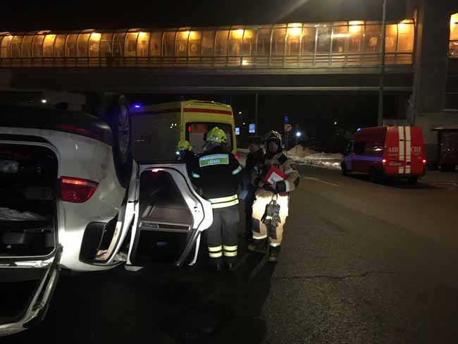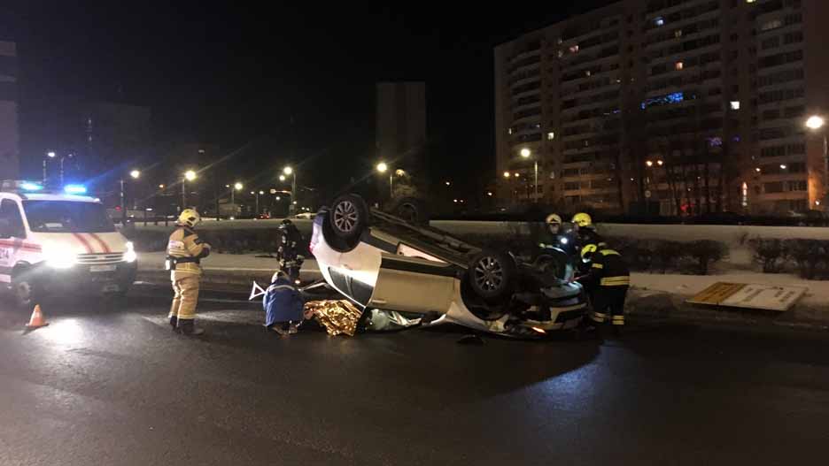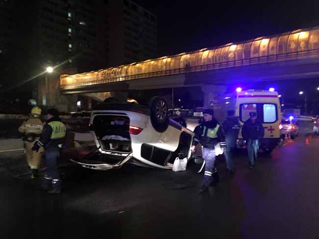 Водитель автомобиля «Фольксваген Туарег» не справилась с управлением и въехала в дорожный указатель на разделительной полосе. Сбитый столб с бетонным основанием упал на землю, а кроссовер опрокинулся на бок и затем, как в замедленной съёмке, аккуратно перевернулся на крышу.