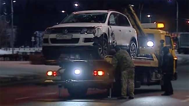 На видео с моментом ДТП действительно присутствует другой автомобиль, но в другой полосе. «Туарег» появляется в кадре в крайней левой полосе, точнее, практически целиком на обочине через три секунды. Столб оказывается посередине траектории.