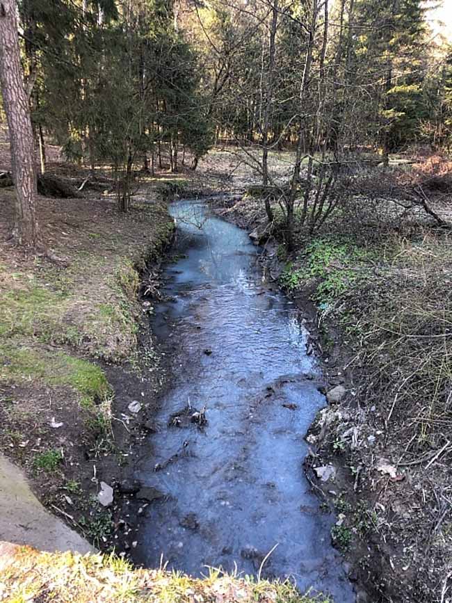 На молочную речку стал похож Болдов ручей в 11-м микрорайоне в среду, 22 апреля. Что-то окрасило его в белый цвет, и от ручья «сильно пахло растворителями, краской или чем-то в этом духе», говорит очевидец.