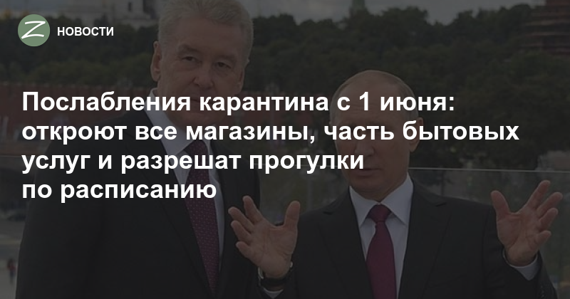 С 1 июня в Москве откроют все непродовольственные магазины и часть бытовых услуг: смогут работать прачечные, химчистки, ремонтные мастерские «и так далее» (точный список неизвестен). Также разрешат прогулки с членами семьи по расписанию. Об этом мэр Москвы рассказал на встрече с президентом Владимиром Путиным.
