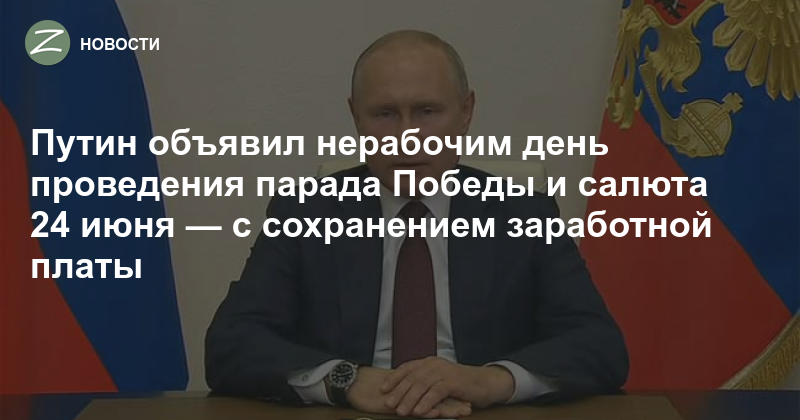 Президент распорядился провести 24 июня военные парады с привлечением вооружения и военной техники в 10 утра и организовать артиллерийские салюты в 22 часа. Соответствующий указ опубликован на сайте правительства страны. Путин объявил день проведения парада нерабочим (это будет среда) с сохранением за работниками заработной платы.