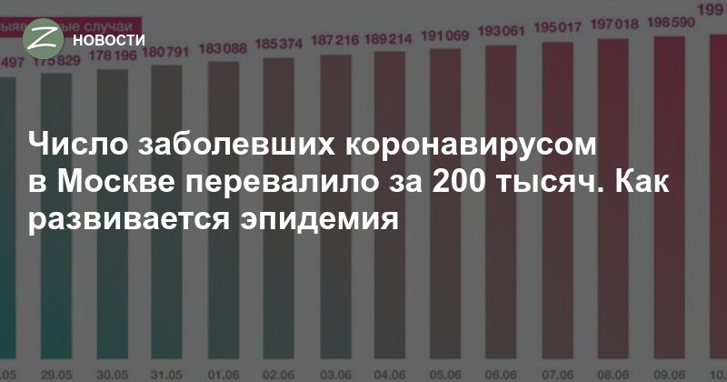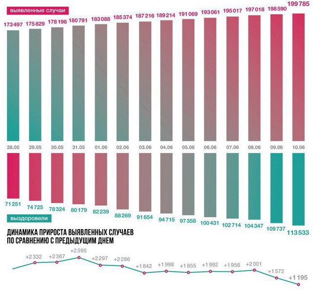 Количество выявленных в Москве случаев заболевания за весь период эпидемии коронавируса к 11 июня превысило 200 тысяч — больше половины заболевших уже выздоровели, более 3000 скончались. К этому же дню общероссийская статистика заболеваемости взяла планку в 500 тысяч заболевших, активных случаев — чуть меньше половины.
