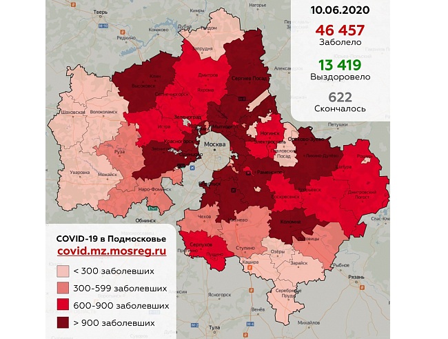 В Московской области резкого уменьшения новых случаев коро навируса, как в Москве, не наблюдается — в течение последнего месяца показатели снизились с 1063 заболевших в день до 700 с лишним и держатся на уровне 700+ уже две недели. Ежедневно выздоравливающих в течение месяца стало заметно больше (с 163 до 600-700 человек в день), а число летальных исходов колебалось от 0 до 32. Всего коронавирусом заболели к 10 июня за весь период эпидемии 46 457 человек, 13 419 выздоровели, скончались 622 человека.
