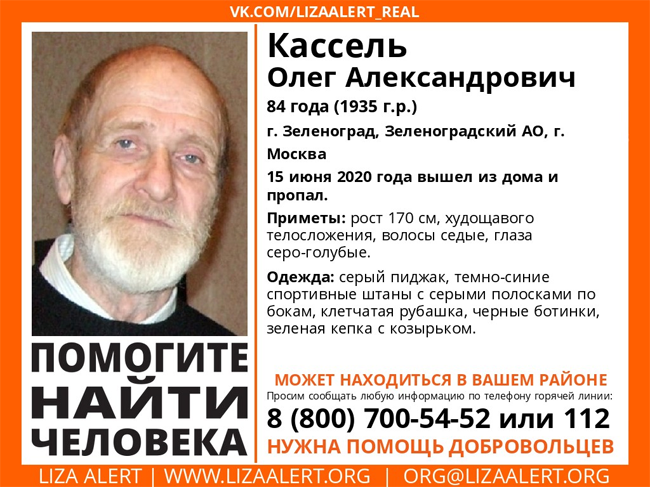 84-летний Олег Кассель пропал в понедельник, 15 июня. Около семи часов вечера он ушёл из дома в Зеленограде и не вернулся. Живёт в 14-м микрорайоне, часто бывает в 4-м микрорайоне. Нужна помощь добровольцев в розыске пропавшего.