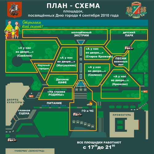 С 16:00 в парке Победы начнут работать тематические площадки для разных возрастов — «Молодежный экстрим», «Детский парк» (заезды для юных велосипедистов и роллеров), «Песни военных лет». Справа от ДК, ближе к лестницам, будет располагаться площадка научно-технического творчества молодежи. «Научный городок» — здесь будут представлены битва роботов, конкурсы, интересные работы зеленоградцев-изобретателей, участвовавших в выставке «Архимед-2010». Будут и традиционные выступления зеленоградских пожарных «На страже Родины» — МЧС представит пожарные машины, тушения автомобиля, эстафету.
