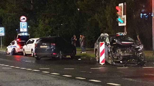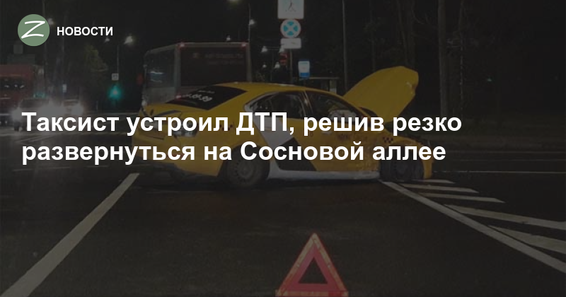 Водитель «Яндекс.Такси» по зелёной стрелке ехал направо с Озёрной аллеи. Потом он изменил траекторию и выехал перпендикулярно на встречную полосу, где в его машину врезался автомобиль, на высокой скорости двигавшийся прямо по Сосновой аллее в сторону центра. Такси развернуло на 180 градусов, и машина въехала в пластиковый барьер, установленный перед фонарным столбом.