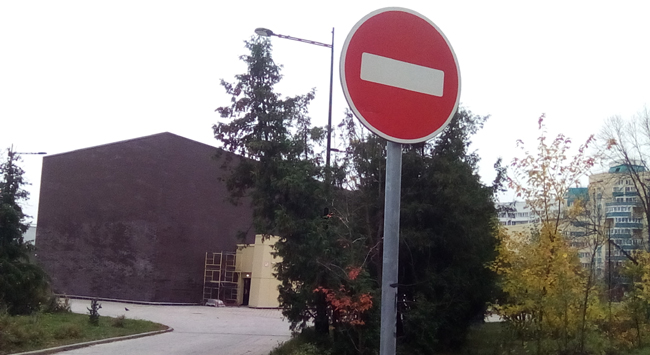 Сейчас ни ограждений, ни шлагбаума нет, а посетители «Электрона» (а может, и просто случайные водители) уже паркуются слева от здания. Заезжают с улицы Николая Злобина, едут по пешеходной дорожке, при этом знак запрета въезда на месте и никого не смущает. Стоявшие здесь ранее гранитные столбики сдвинуты и не мешают проезду, один вообще валяется на земле.