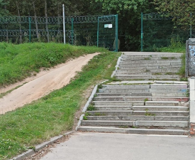 Лестница на территории МИЭТа на маршруте из лесопарка 9-го микрорайона давно нуждается в ремонте. Кроме того, она никак не приспособлена для маломобильных пешеходов. Велосипедисты накатали сбоку спуск, а людям с колясками проехать там вообще невозможно.