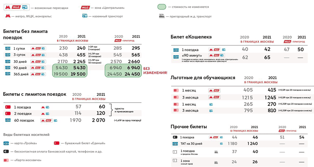 Тариф «90 минут» (одна поездка на метро, МЦК, МЦД и любое число пересадок на наземном транспорте) — с 62 до 65 рублей.