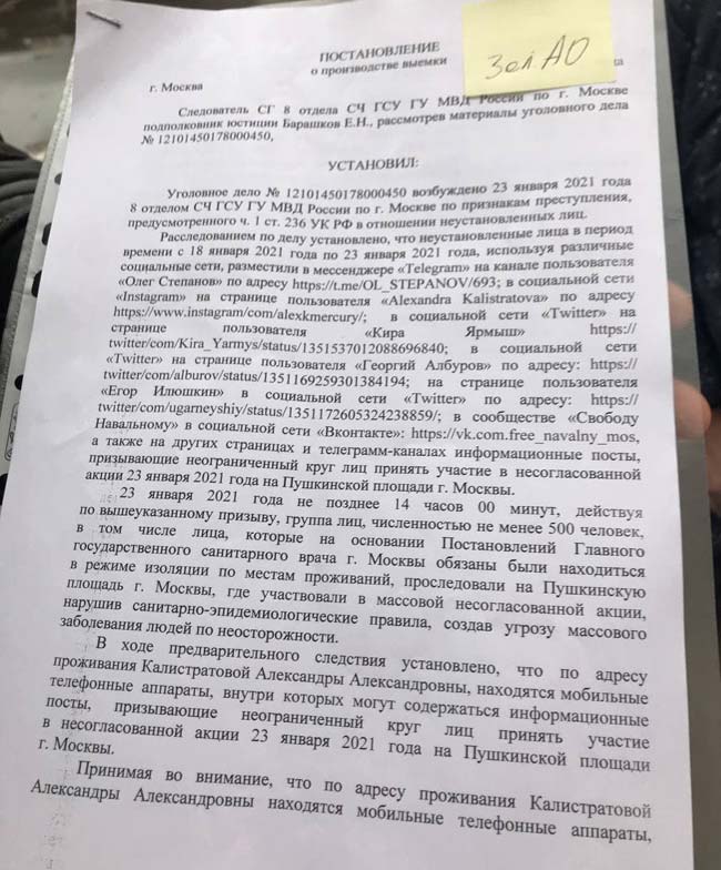 Во вторник около 15:30 сотрудник полиции ждал жительницу Зеленограда Александру Калистратову возле подъезда её дома, чтобы изъять её телефон. Причина — в её инстаграме якобы был размещен призыв прийти на митинг 23 января. Люди на митинг пришли, а среди них были больные ковидом. По версии следствия, это создало «угрозу массового заболевания людей».