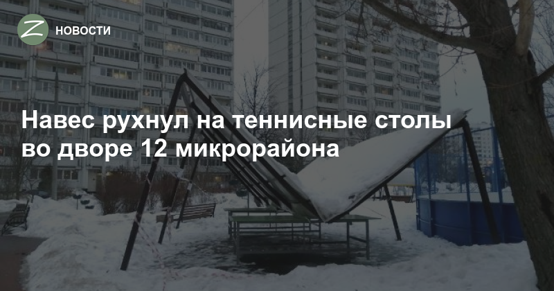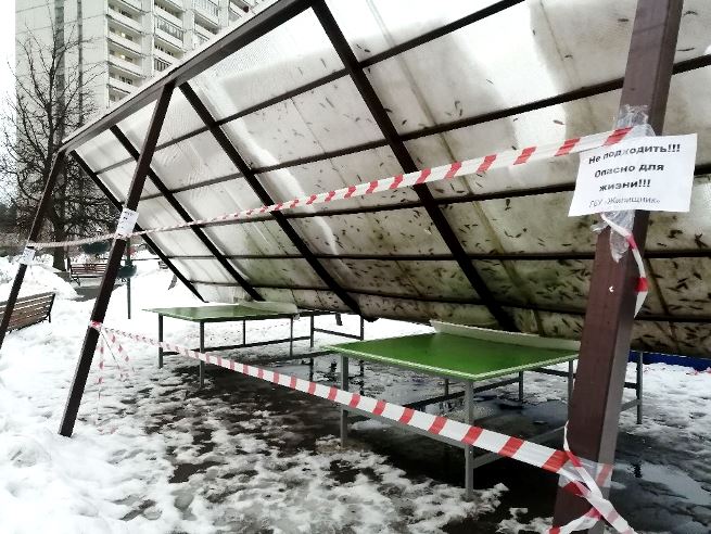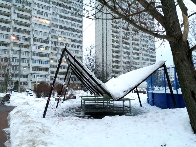 Во дворе у корпуса 1201 сломался навес над теннисными столами: крыша сложилась внутрь. Возможно, причина в тяжести снега на ней.