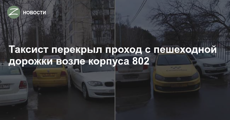 Вот так припарковался таксист с торца корпуса 802 утром во вторник, 2 марта, перекрыв проход с пешеходной дорожки, ведущей к детскому садику и школе.