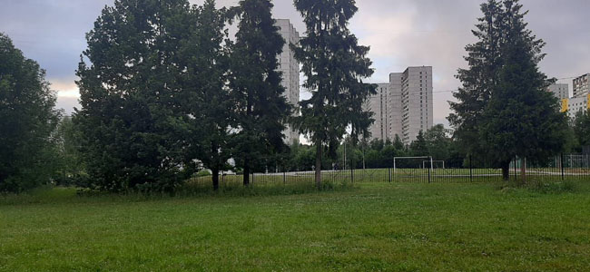 Под строительство спорткомплекса выделен участок 5,5 гектара «у корпуса 1115», как указан адрес в торгах. Корпус 1115 — это начальная школа. Рядом с ней — детский сад. А участок, зарезервированный под ФОК, находится ближе к детсаду — между ним и корпусом 1106. Здесь зеленая территория с деревьями и кустами.