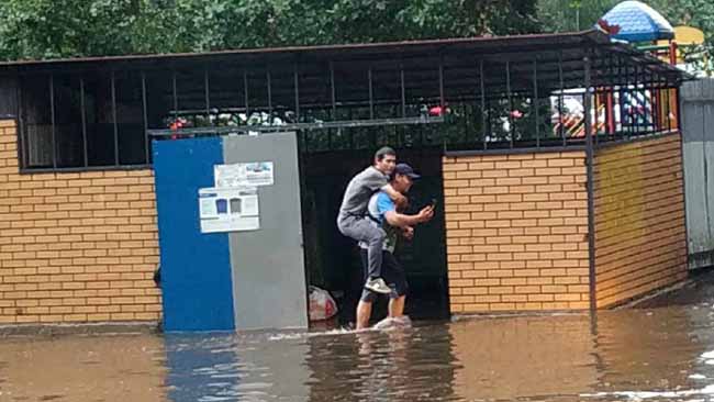 Возле корпуса 445 в ливнёвку набились сорванные шквалом ветки деревьев — дворовый проезд мгновенно затопило. Дворники вручную чистили сток от нанесённого мусора, показала на видео Татьяна.