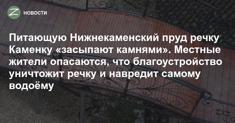 Под новым мостиком, который уже установили в рамках благоустройства, речка течёт между габионами и навалами щебня в виде узкого ручейка. «И это при том, что сейчас идет дождь — пять часов назад ручейка почти не было, вода еле-еле проходила», — рассказала редакции местная жительница Анжела. — Прямо сейчас речку продолжают засыпать и фактически уничтожают! Если это срочно не остановить, погибнет и весь Нижнекаменский пруд, он станет заболоченным".