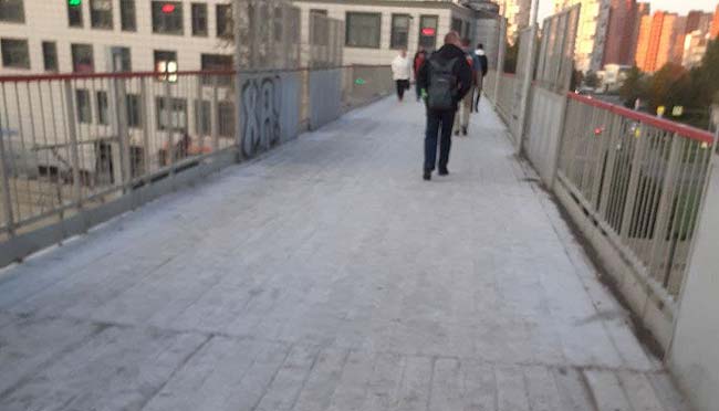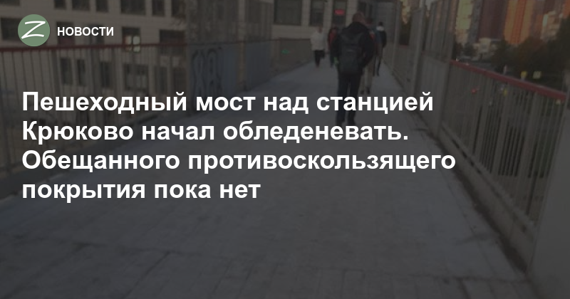 Деревянное покрытие пешеходного моста над станцией Крюково покрылось скользким инеем сегодня рано утром. В РЖД обещали до октября уложить на мосту противоскользящее покрытие, но пока это не сделано — для выполнения обещания остался один день.