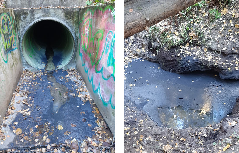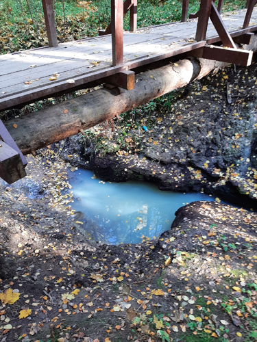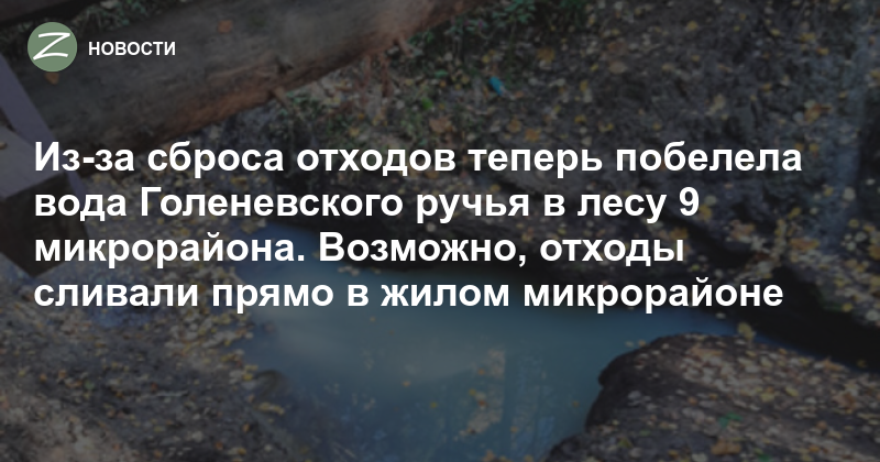 В голубовато-белый цвет окрасился Голеневский ручей в лесопарке 9 микрорайона — фотографию ручья рядом с мостиком прислала в субботу, 9 октября, читательница «Зеленоград.ру» Елена Ш. «Там пьют наши собаки, и дети в воде часто играют, потому опасно», — заметила она. После сообщения о произошедшем в зеленоградское отделение «Мосводостока» там пообещали отправить на место бригаду. Выяснилось, что произошёл такой же залповый сброс отходов в решётку ливневой канализации, как и те, от которых страдают в последние годы другие зеленоградские ручьи и речки.