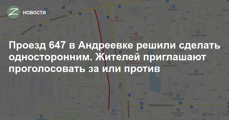 Одностороннее движение предлагается ввести в проезде 647 — это дорога за торговыми палатками и гаражами, идущая параллельно улице Андреевка и вдоль местных домов. Мосавтодор и автоинспекция считают, что транспорт на этой улице может двигаться только от Жилинской улицы. Жители Андреевки и Голубого могут поддержать (или наоборот) это предложение до 28 октября.