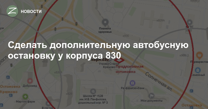 Сделать дополнительную автобусную остановку на Солнечной аллее у корпуса 830 предложил местный житель Василий Иванов — с этим предложением он обратился в префектуру. По его мнению, такая остановка будет удобна для жителей 8, 9 и 10 микрорайонов, которые ездят по Солнечной аллее в сторону МИЭТа.
