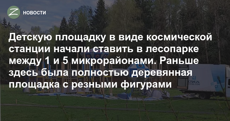 В популярном месте для прогулок — на «Солнечной поляне» в лесопарке между 1 и 5 микрорайонами начали ставить новую детскую площадку. Старую — полностью деревянную — демонтировали. Новая площадка — типовой детский комплекс с «космическими» мотивами. В лесопарке он выглядит довольно чужеродно.