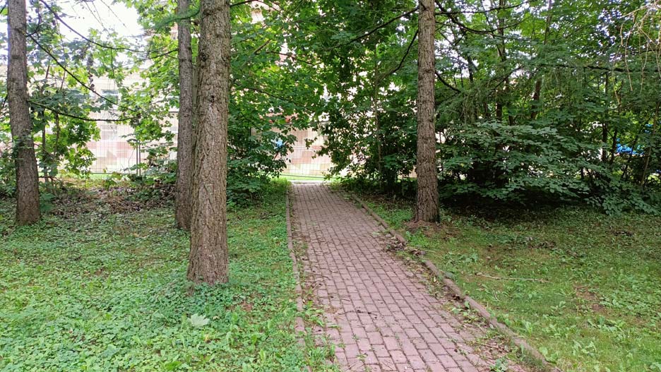 Это очень милое место — расположено прямо на улице Юности, но так густо окружено зеленью, что пройдешь мимо, если не знать. К началу нынешнего ремонта от площадки осталась только сеть дорожек из брусчатки, несколько лавочек и песочница. При этом на ней постоянно кто-то был — и чаще даже не родители с детьми.