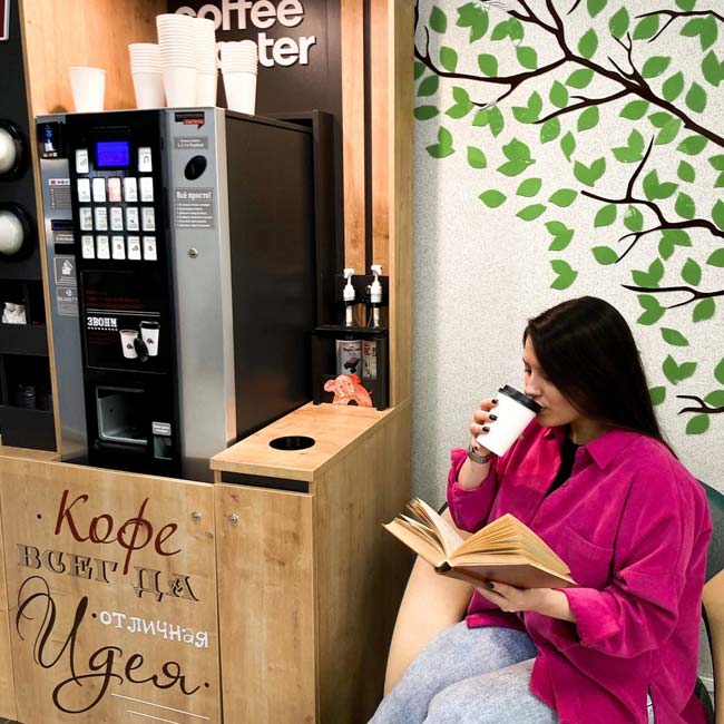 Кофе-точка доступна в часы работы библиотеки: вторник-суббота с 10 до 22, воскресенье с 10 до 20.