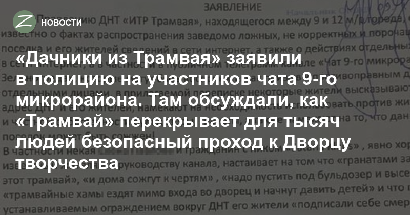 Председатель правления дачного товарищества «ИТР Трамвая» Мария Лаврентьева заявила в полицию о «действиях отдельных граждан в чате 9-го микрорайона, которые могут быть восприняты как призыв к противоправным действиям». Эти действия — обсуждение в чате, как возглавляемый ею дачный поселок собирается перекрыть пешеходные проходы от Панфиловского проспекта к Дворцу творчества. Тысячи людей, которые десятилетиями ходили по этой городской земле, действиям «Трамвая» недовольны и обсуждают их.