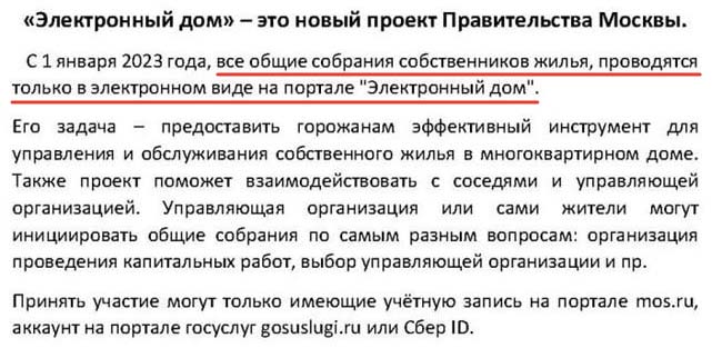 В листовке «Жилищнике» лишнее слово «только». Действительно, ЖК предусматривает проведение ОСС в заочной форме с использованием электронной системы, но ни о каком переходе исключительно на электронные собрания, тем более с помощью конкретной системы речи не идёт. Нет никаких изменений в ЖК или другие законы, которые запрещают собственникам проводить общие собрания в традиционной форме.