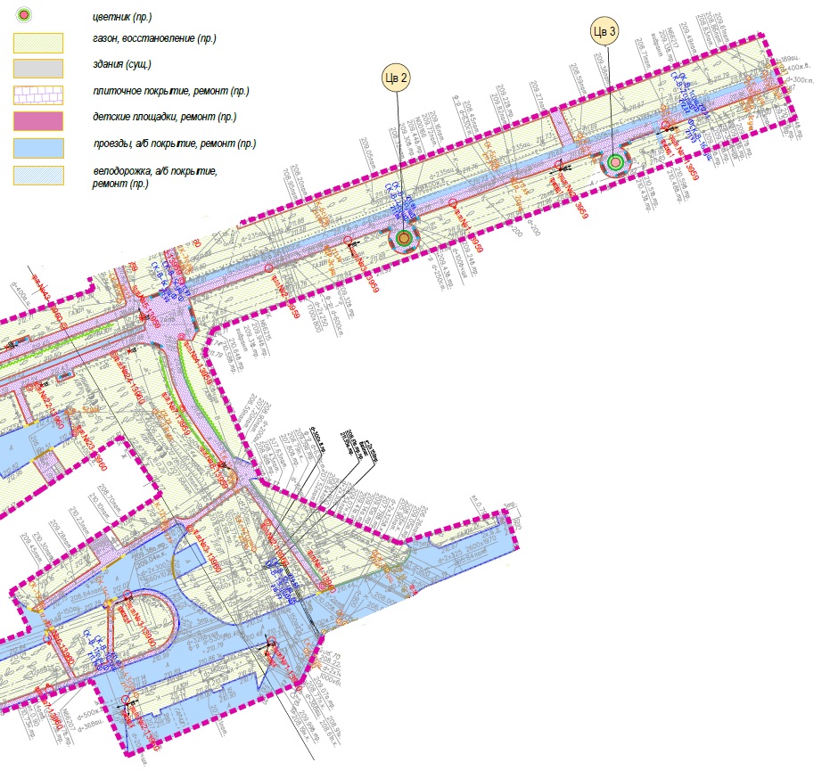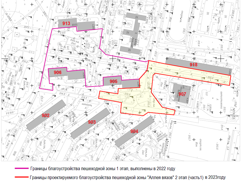 Предполагалось, что на втором этапе обновят дорожки вдоль корпусов 918 и 919, на продолжении «Аллеи вязов». Однако, судя по ситуационному плану в конкурсной документации, благоустраивать будут только половину этого отрезка — вдоль корпуса 918. Кроме того, в зону благоустройства войдёт также дорожка между корпусами 905 и 907 (бывший ДЮЦ «Восток») и территория за корпусом 905 вплоть до местного проезда.