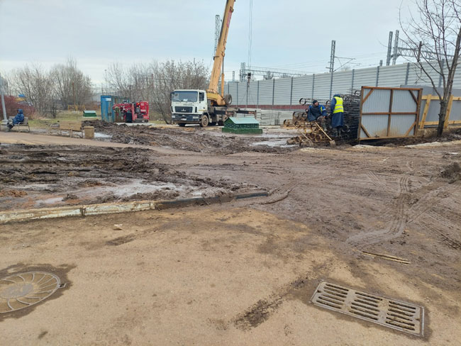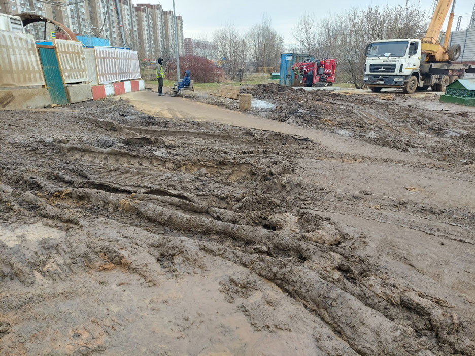 Асфальтированную дорожку частично перегородила стройка, вокруг неё сделали деревянный настил, но вот остаток дорожки разбит грузовиками, завален грязью, место проведения работ и складирования стройматериалов не огорожены. Очевидно, такой обход нельзя назвать удобным и безопасным.