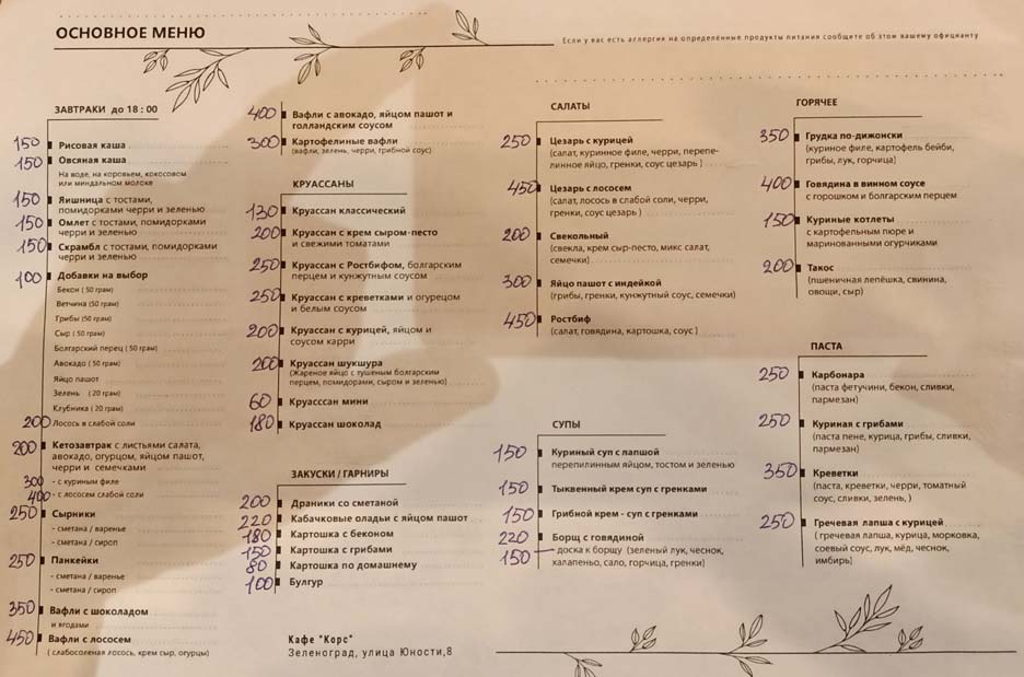 В меню нового кафе: завтраки (до 18 часов), бизнес-ланчи (300-400 рублей), выпечка, закуски, салаты, супы, горячее, паста, напитки.