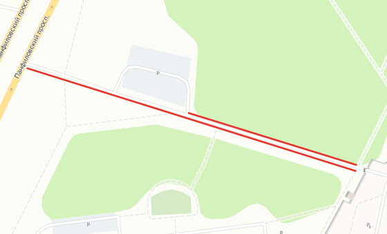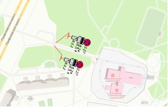 Зона действия знаков охватит практически весь проезд с обеих сторон, исключая небольшую парковку, расположенную у леса. Обоснование: «Припаркованные вдоль проезда транспортные средства затрудняют проезд к зданию поликлиники и создают угрозу безопасности дорожного движения».