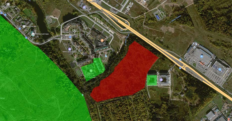 Участок находится как раз на границе Москвы (Зеленограда) и Московской области. Концерн «Крост» получил его по сути даром — по программе «земля за рубль». На таких условиях приятно отхватить землю со всеми коммуникациями, игнорируя, что она находится фактически внутри сложившейся жилой застройки и граничит с особо охраняемой природной территорией.