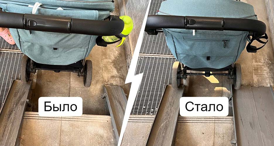 Пандус в любом случае неудобен для колясочников, это профанация заботы о них. С большой коляской пандус - тоже ничего приятного (пологий спуск лучше), а прогулочную коляску по всем существующим переходам удобнее переносить на руках вместе с ребенком по лестнице, не наматывая круги по пологим спускам.