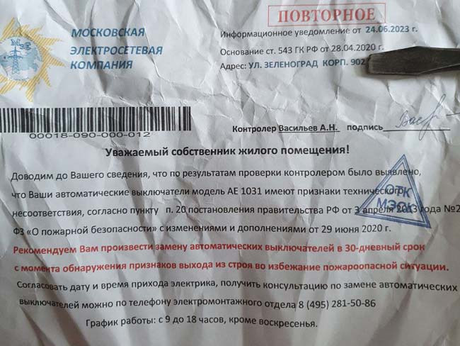 У аферистов два метода «работы с населением». Первый — раскладывать бумажные уведомления в почтовые ящики. Там рекомендовалось заменить якобы неисправный автоматический выключатель, чтобы избежать пожара. И номер телефона для вызова мастера. Для солидности — ссылка на постановление правительства РФ «О пожарной безопасности», печать «ОТК» (отдел технического контроля) с подписью и логотип организации с названием «Мосэлектросеть», «Мосэнергоконтроль» или «Московская электросетевая компания», иногда с сокращением МЭС — как у «Мосэлектросбыта». Выключатель стоимостью около ста рублей предлагали менять за 3500-4500 рублей.