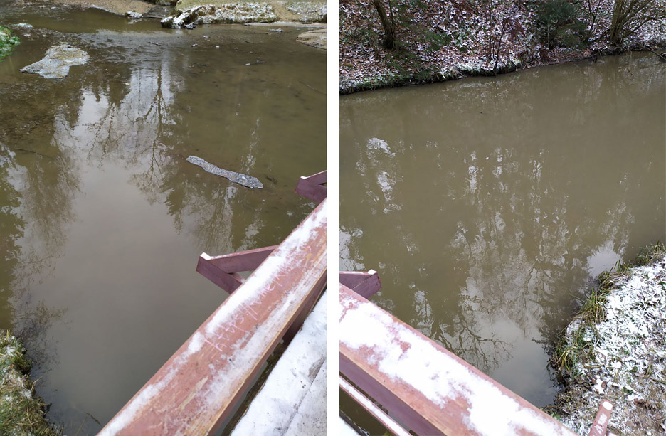 Глинистый цвет воды в реке Сходне и неожиданное осеннее половодье, которое зеленоградцы наблюдали в лесопарке между 9 и 12 микрорайонами в начале ноября, «Мосводосток» объяснил «поступлением в реку воды с примесью песка и глины» — там сообщили, что источник сброса не обнаружен. Вода в реке пришла в более или менее нормальное состояние уже на следующий день. Однако на этой неделе жительница 9-го микрорайона рассказала: «Опять в нашей речке глинистая муть». Мы попытались найти источник загрязнения.