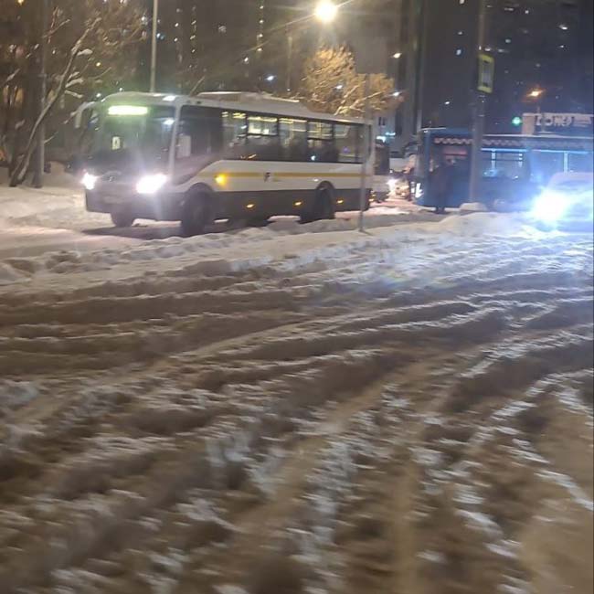 Автобусы с трудом передвигаются по Крюковской площади из-за снега на дорогах и сломавшегося автобуса. «От станции в старый город на автобусе пока что не уехать», — написала в 17:45 наша читательница Mary и прислала фотографии снежной каши на дорогах и застрявшего автобуса, который люди толкали вперед. На въезде на площадь выстроилась очередь из десятков автобусов.