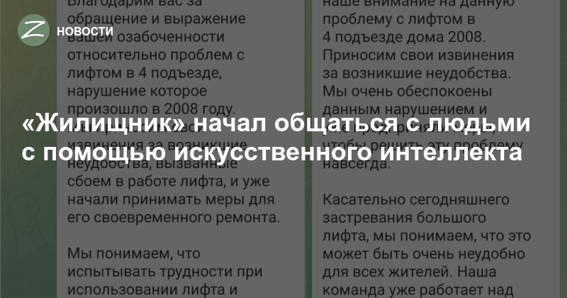Жительница корпуса 2008 Надежда пожаловалась на неисправность лифта. «Застревает целый день у всех по многу раз. Чтобы ехать дальше — нужно попрыгать. Вы серьезно? До 8-го этажа прыгать?» — написала она в чат «Жилищника». Стиль и смысл полученных ответов очень напоминает ответ нейросети вроде ChatGPT на запрос типа «ответь вежливо на жалобу».